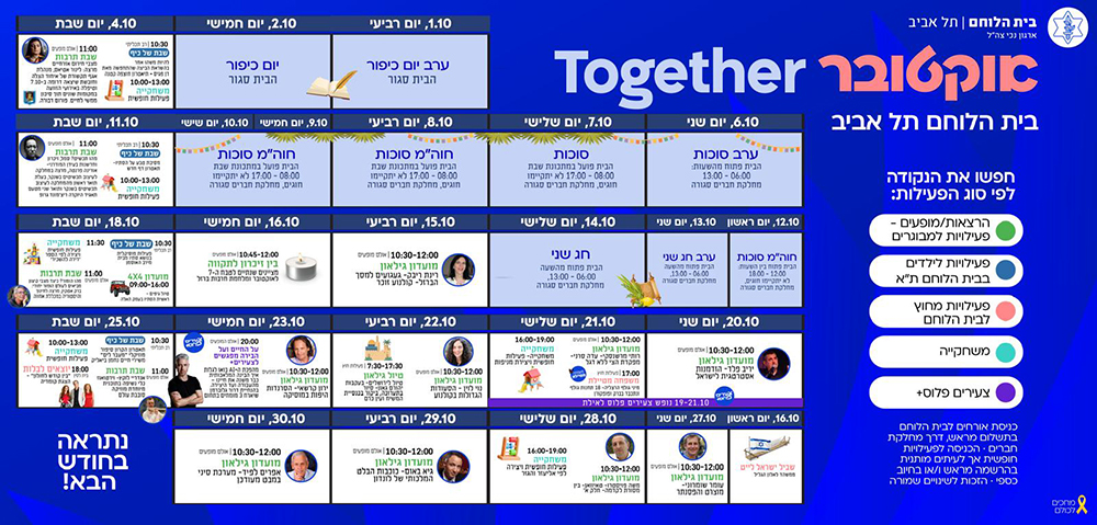 מגוון פעילויות לכל הגילאים: גימלאים, צעירים פלוס, משפחה מטיילת הורים וילדים ועוד.הולך להיות חודש מהנה וחגיגי. לחץ כאן להגדלת אירועי אוקטובר 2025 >>