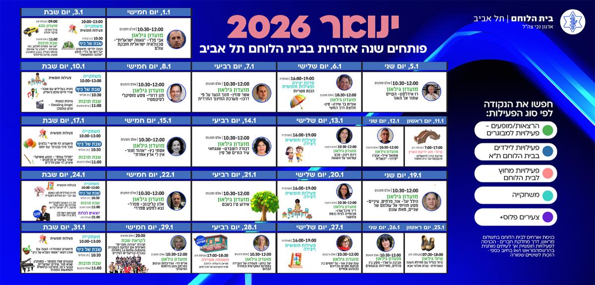מגוון פעילויות לכל הגילאים גימלאים, צעירים פלוס, משפחה מטיילת הורים וילדים ועוד.פתיחת שנת 2026 לחץ כאן להגדלת אירועי ינואר 2026 >>