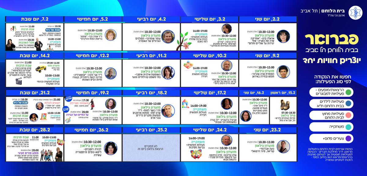 מגוון פעילויות לכל הגילאים: גימלאים, צעירים פלוס, משפחה מטיילת הורים וילדים ועוד.הולך להיות חודש מהנה וחגיגי. לחץ כאן להגדלת אירועי פברואר 2026 >>