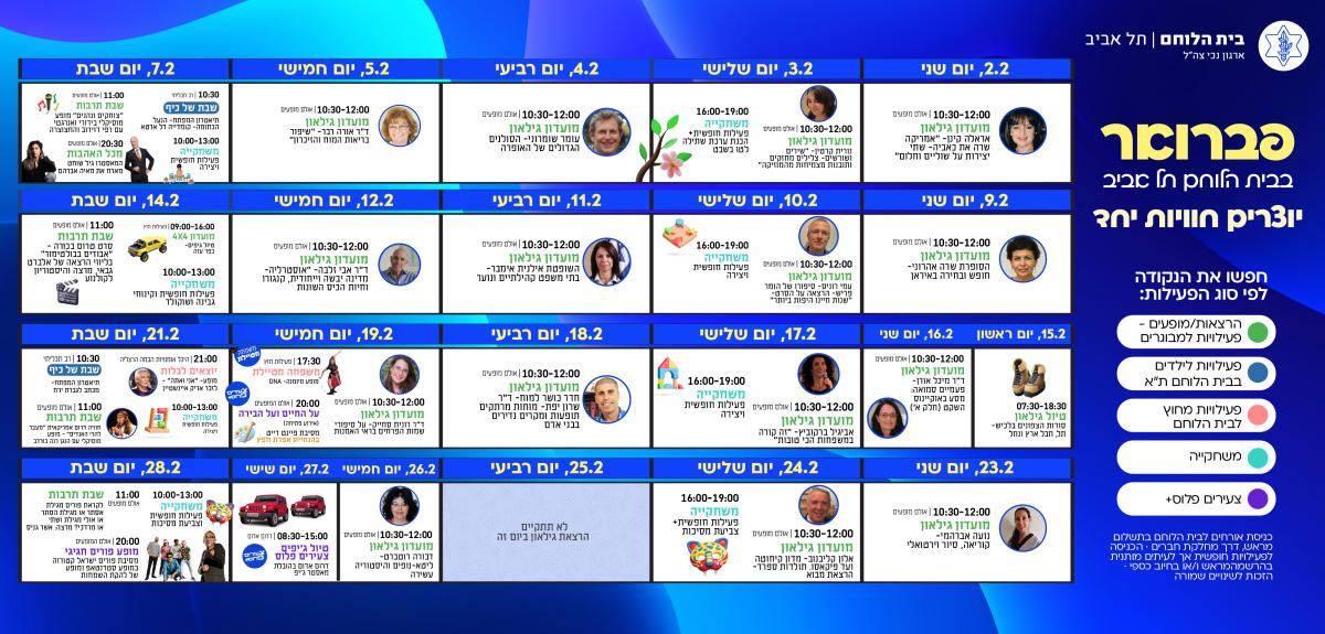 מגוון פעילויות לכל הגילאים: גימלאים, צעירים פלוס, משפחה מטיילת הורים וילדים ועוד.הולך להיות חודש מהנה וחגיגי. לחץ כאן להגדלת אירועי פברואר 2026 >>